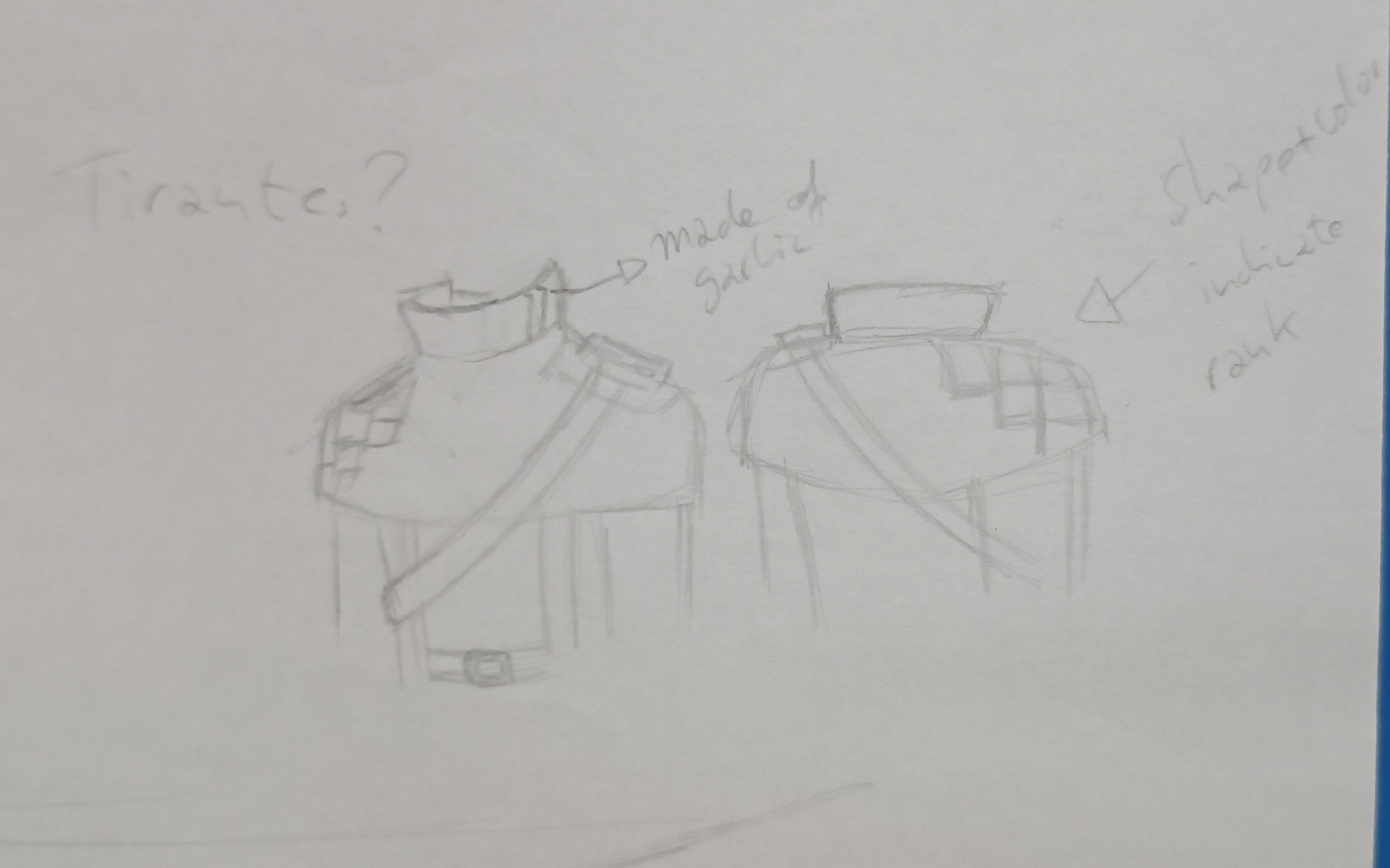 The yellow stripes on the neck piece are made of garlic, the shape and color of the right shoulder's patterns indicate rank. Hunters were the highest rank before the change.