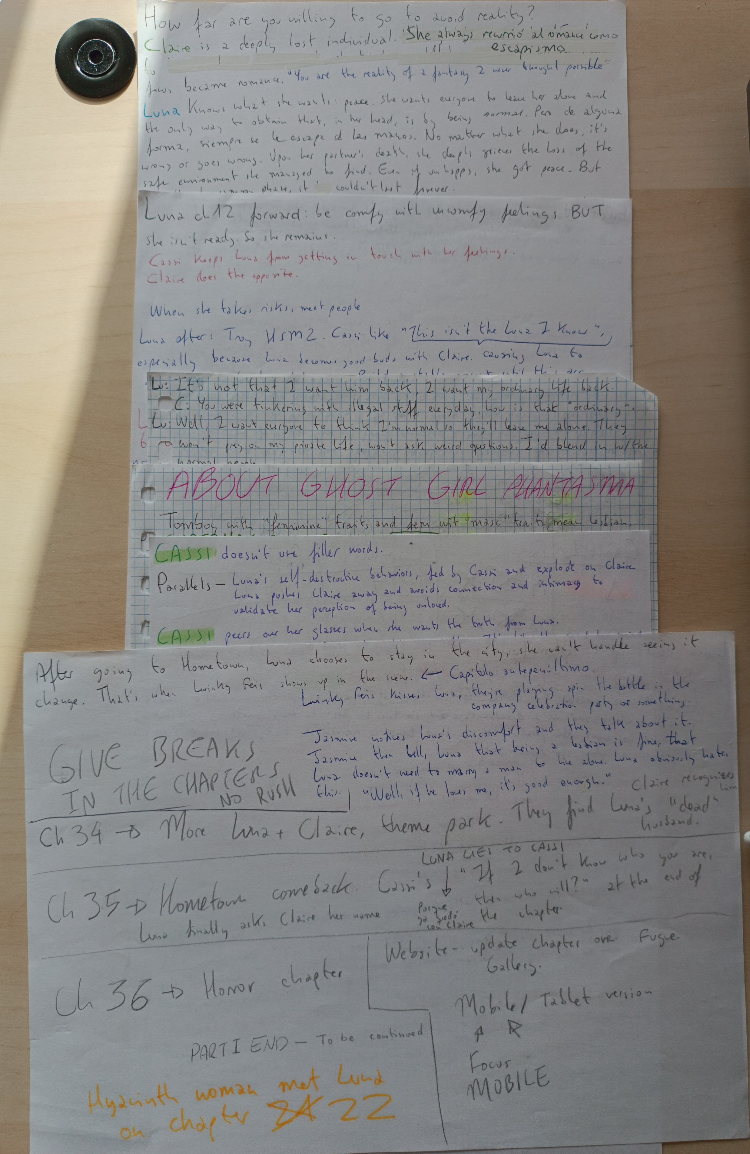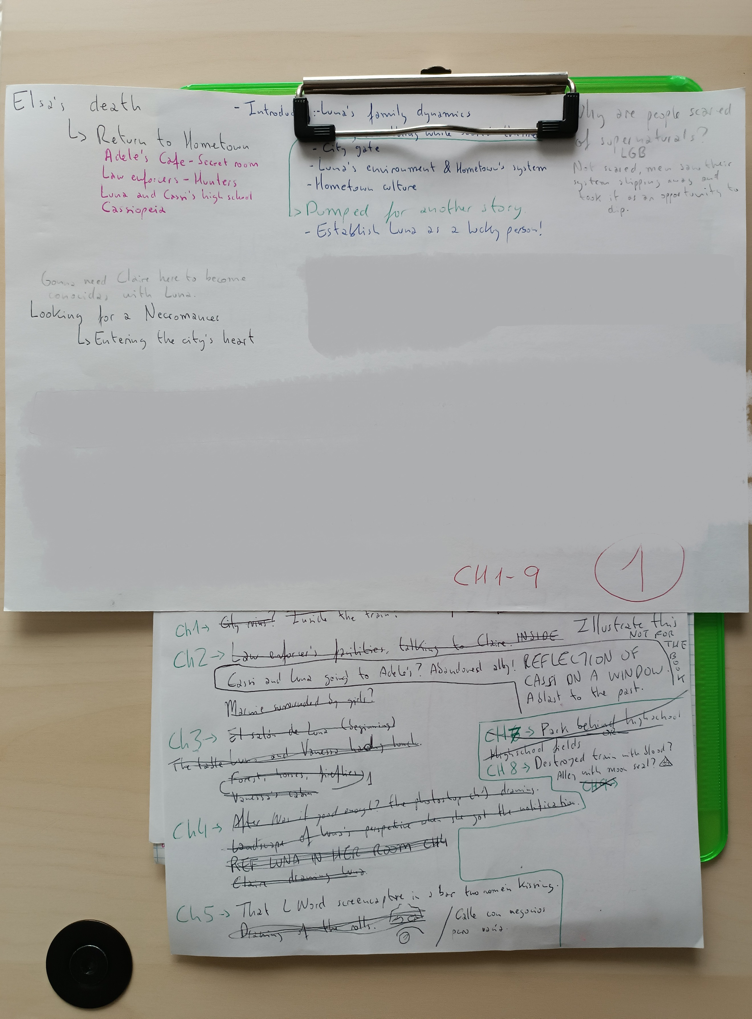 The paper on top holds ideas written when Sam E. Moon first scrapped most of the chapters written for the contest. Half of it had to be censored, as they are ideas that will get used in the future. The paper below has ideas for the illustrations. They were harder to draw than they seem, so the author decided not to do so many. Then she came up with an excuse for it subtly reflected in the story itself.